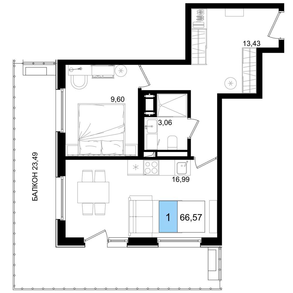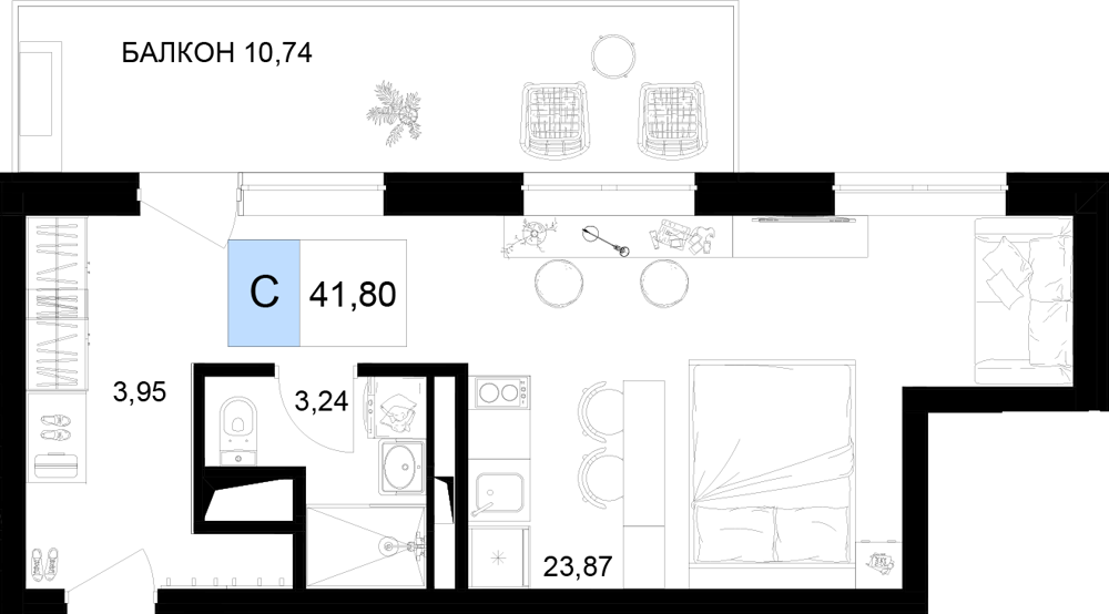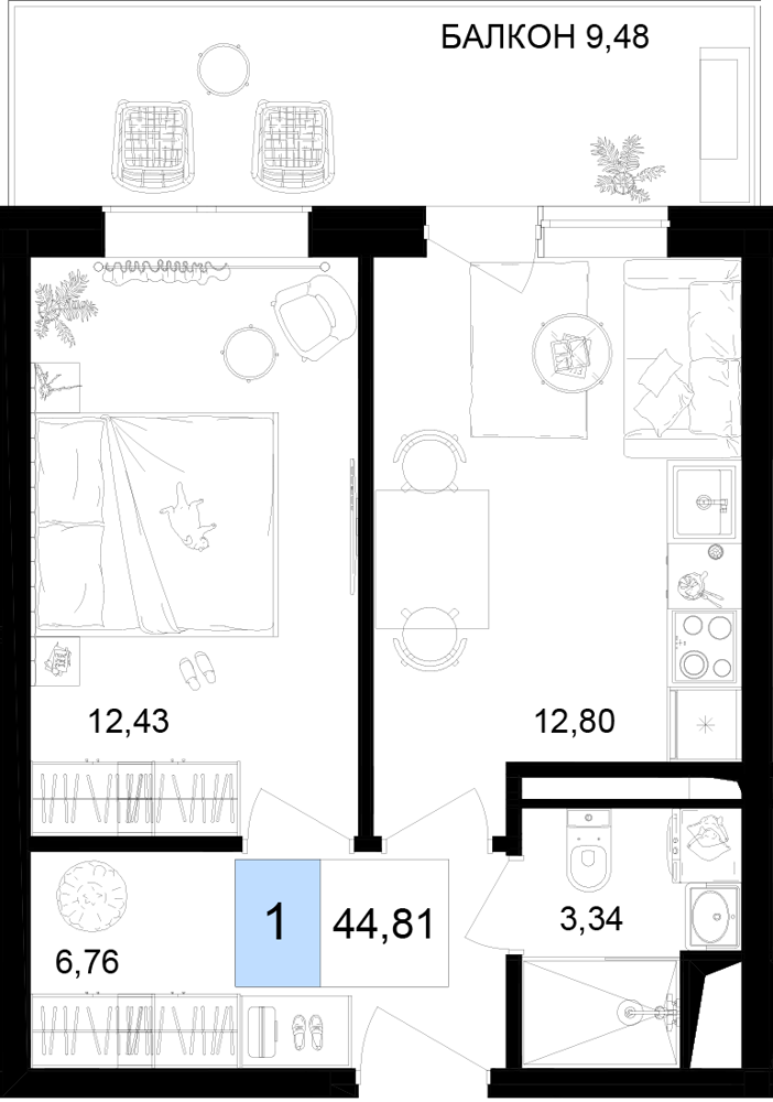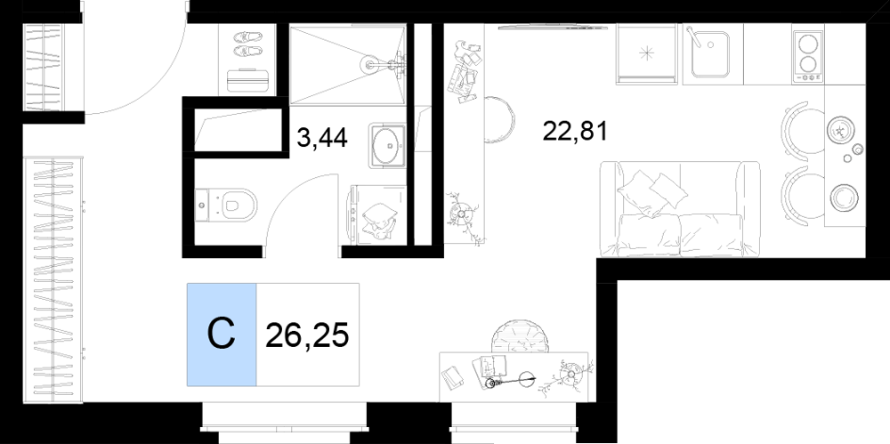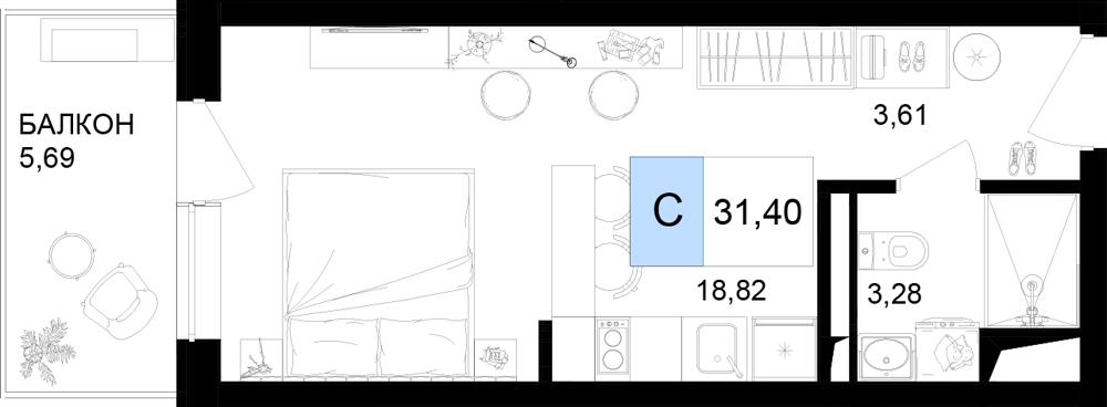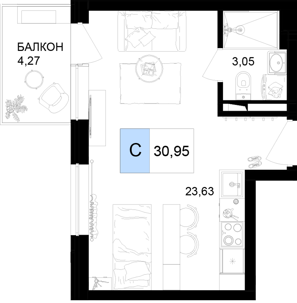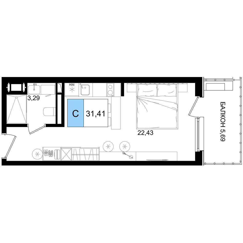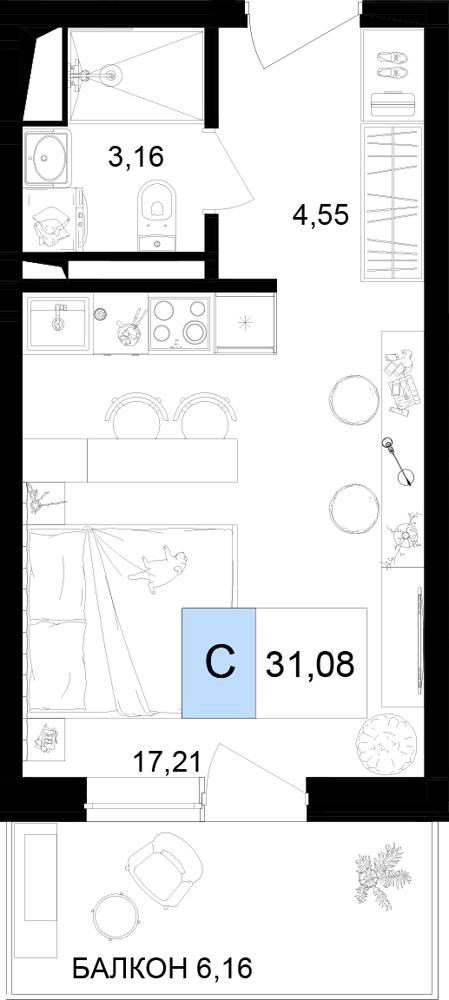 - Номера-студии (от 26.25 м² до 31.41 м²): Компактные и функциональные решения с балконом.