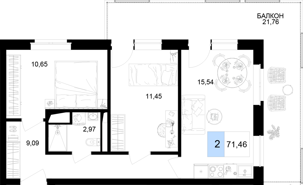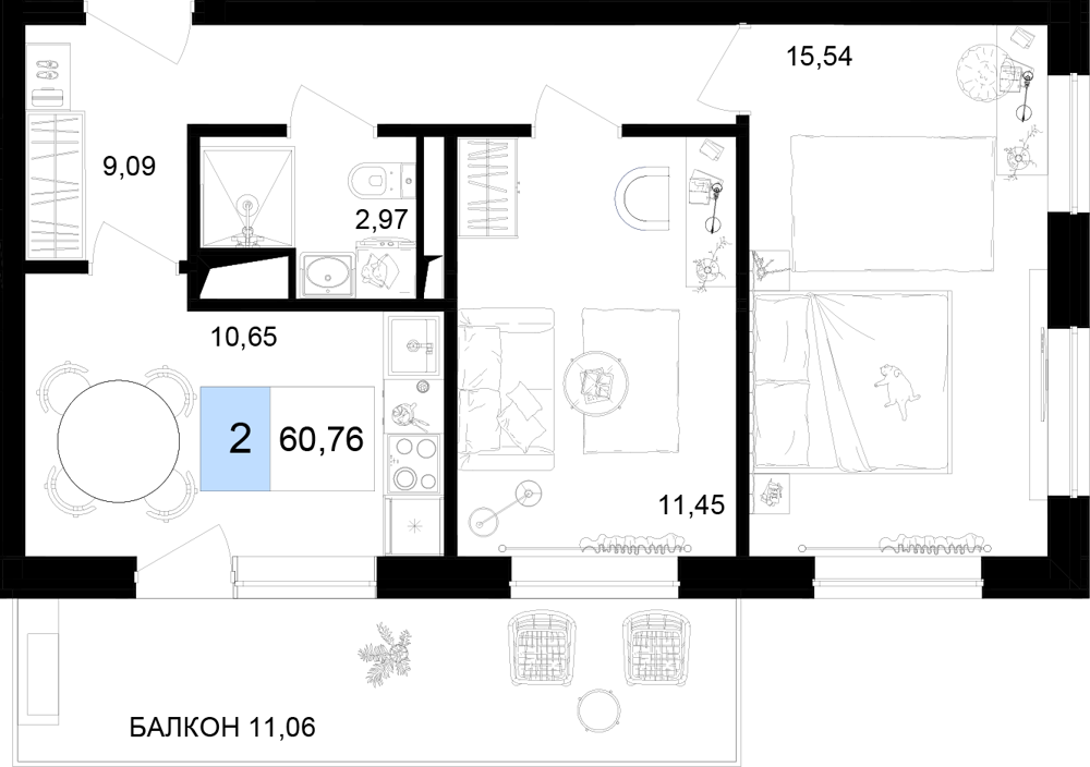 - Двухкомнатные номера (от 54.28 м² до 87.90 м²): Просторные апартаменты для семьи или компании, с несколькими балконами.