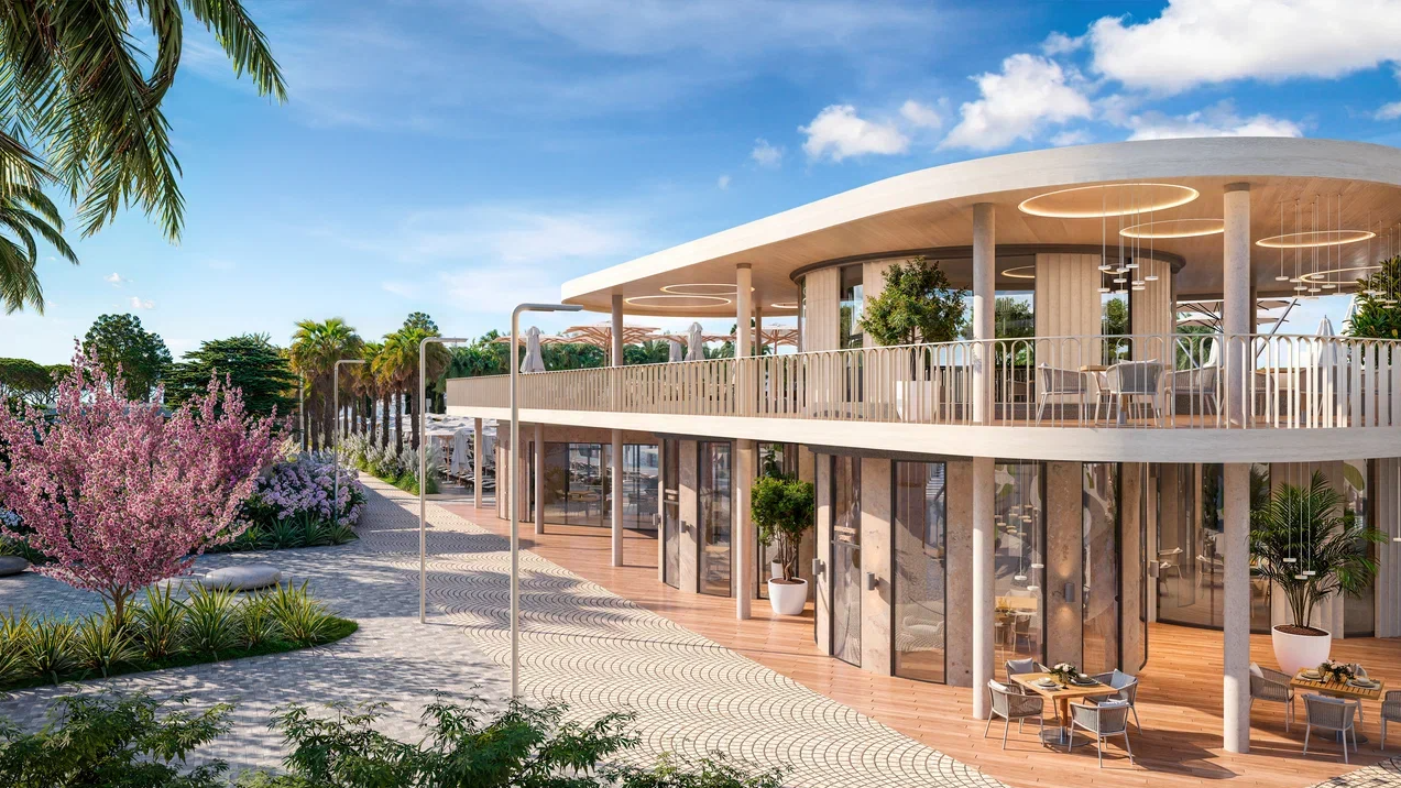 - Пляж и бассейн: Шаговая доступность к пляжу, собственный круглогодичный бассейн площадью 1209 м² с островом.