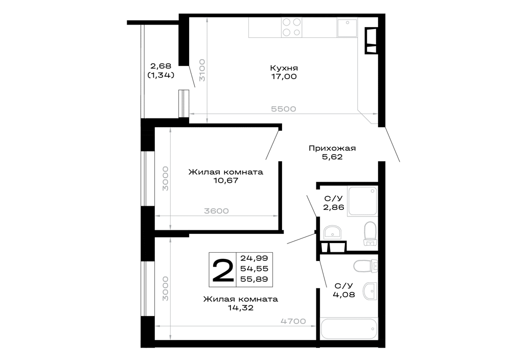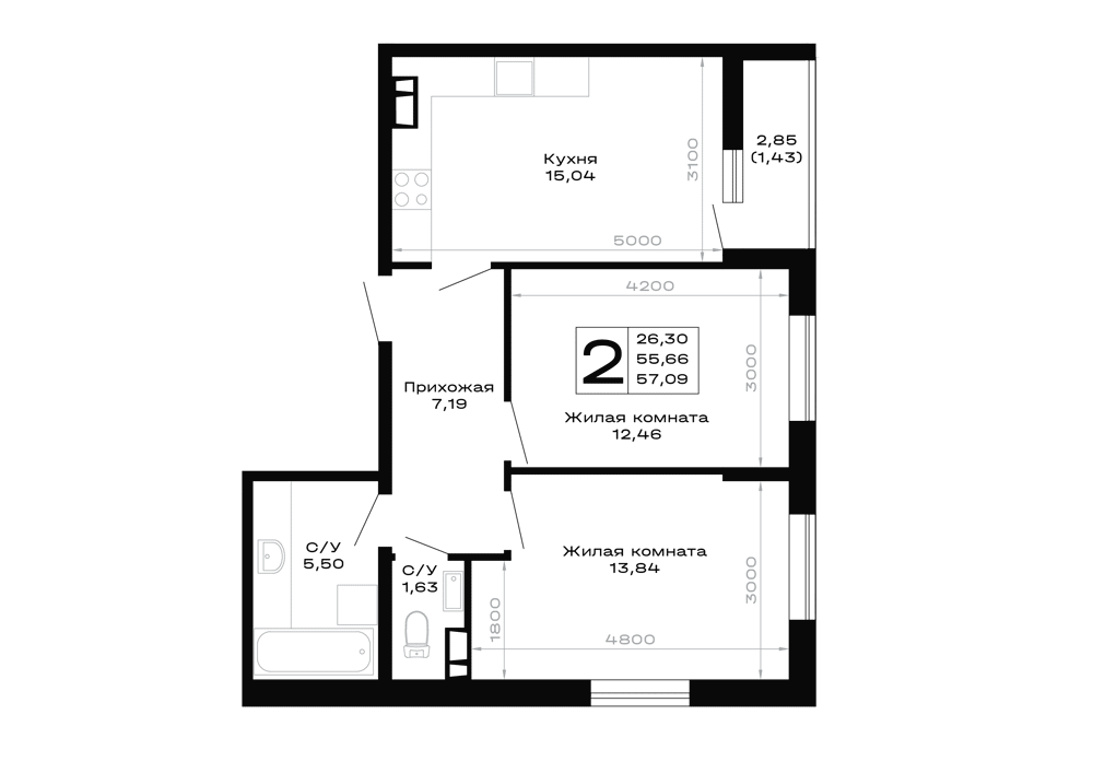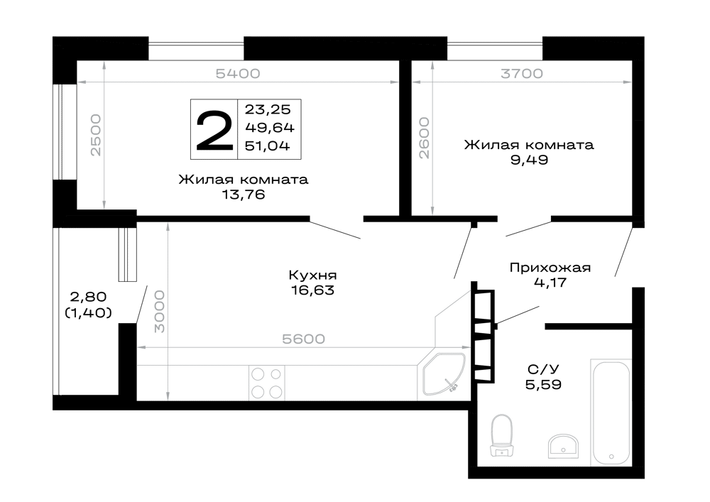 - Двухкомнатные: просторные варианты для семьи, например, планировка 2К площадью 50.0 м²