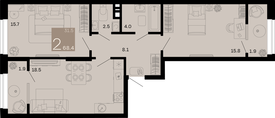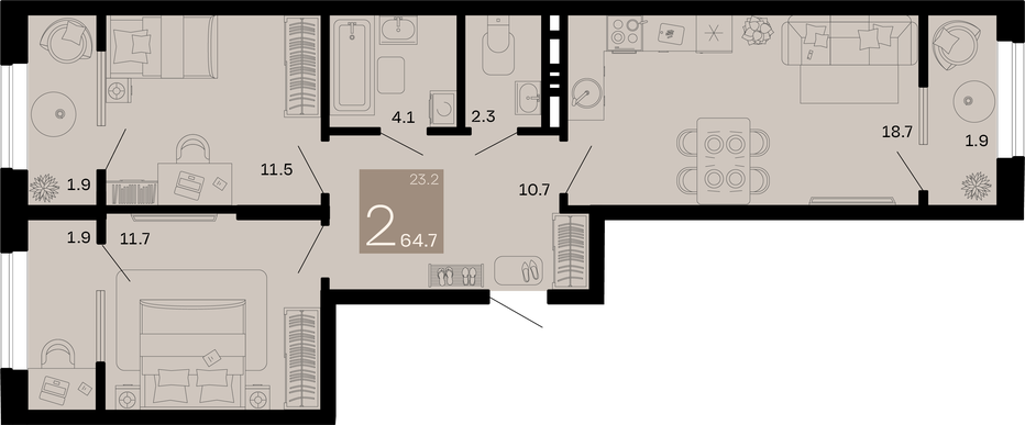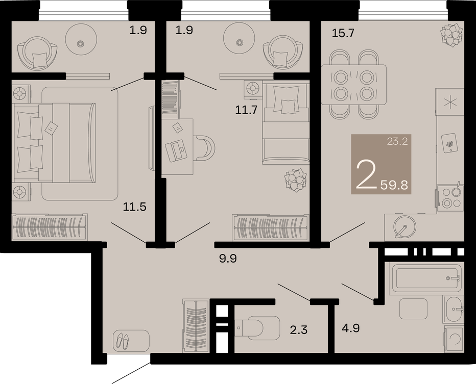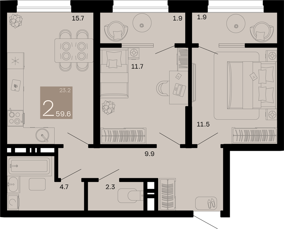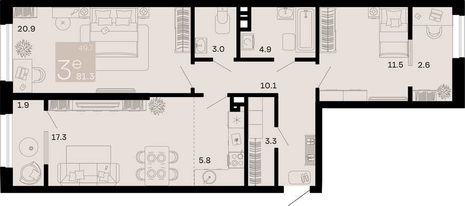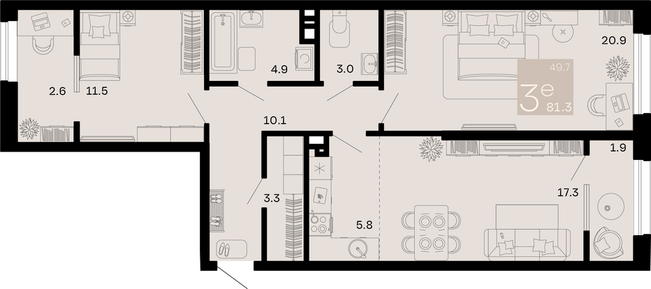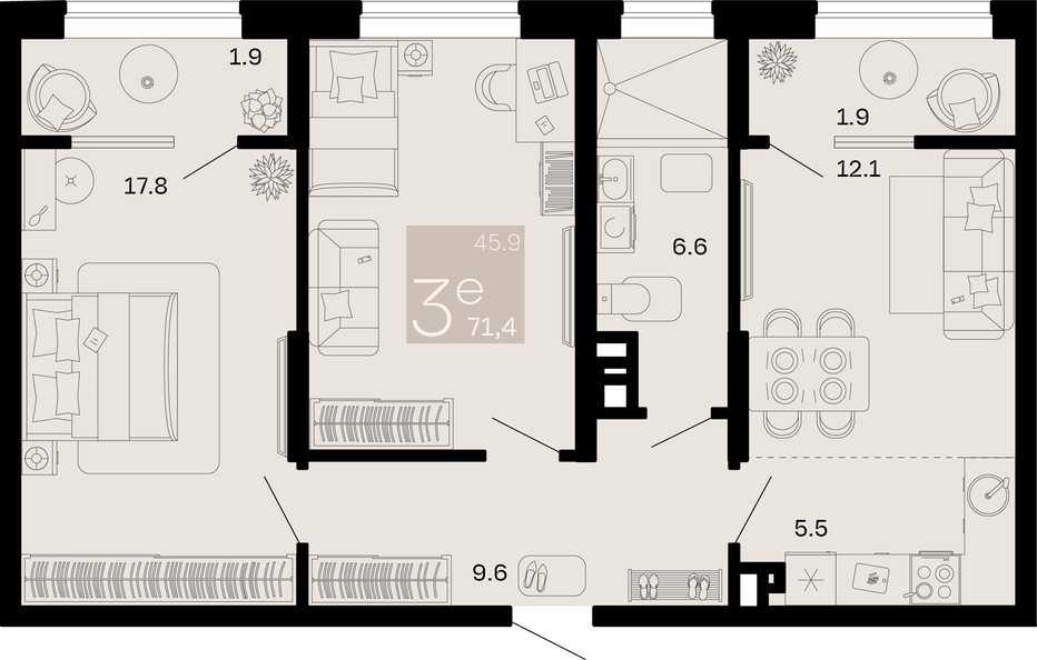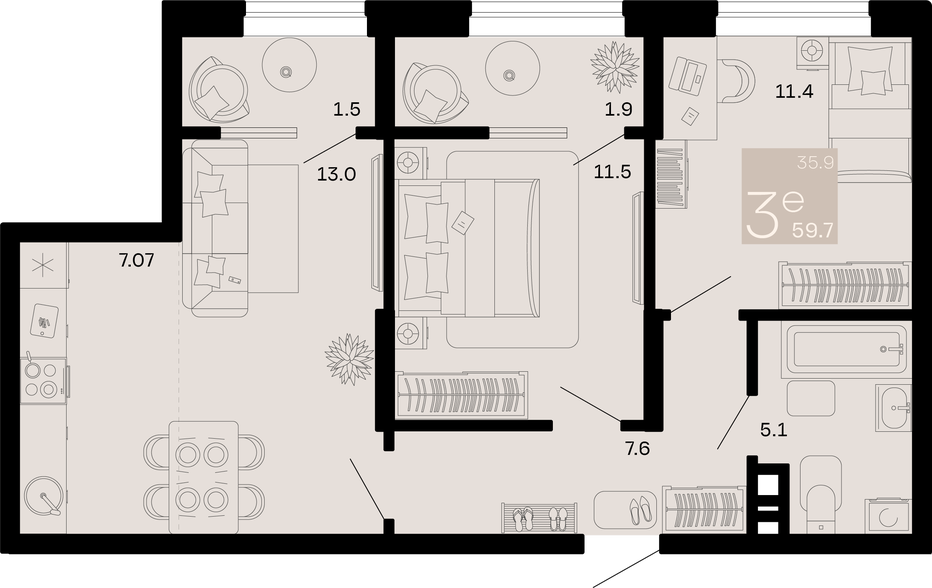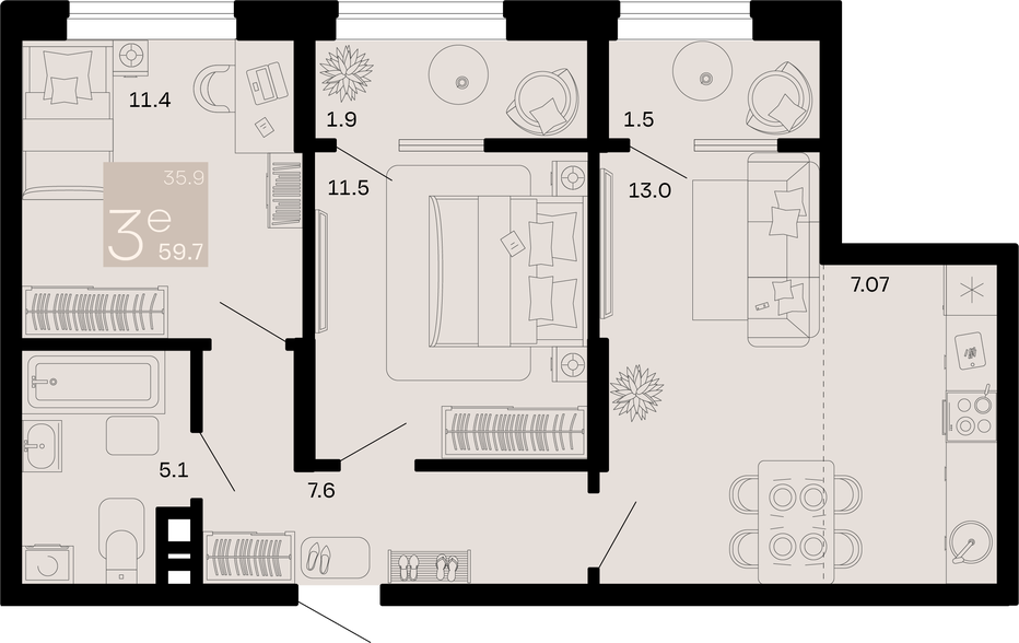 - Трехкомнатные: от 59.7 до 85.4 м².