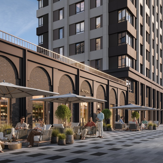- Коммерция: На первых этажах расположатся рестораны, кафе, аптеки и магазины в формате street retail.