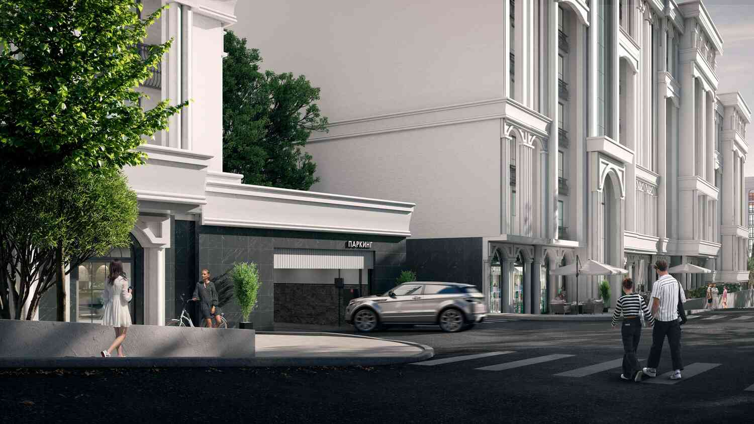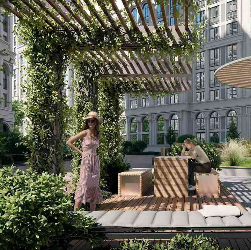 - Благоустройство: Закрытая охраняемая территория с прогулочной аллеей, подземным паркингом, кладовыми помещениями и продуманным озеленением.